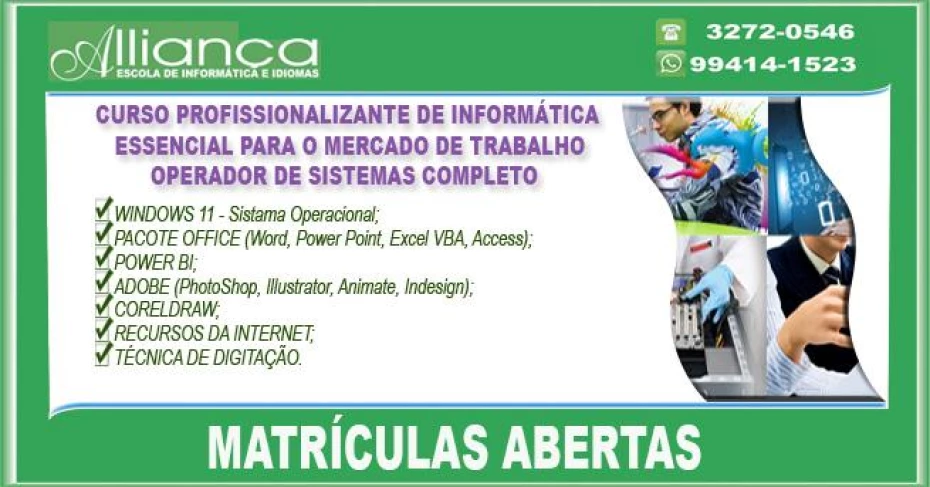 Oferecemos cursos na área de informáticaOferecemos cursos na área de informática em Parnamirim. Na Alliança Escola de Informática, oferecemos cursos profissionalizantes em informática, preparando você para o mercado de trabalho.